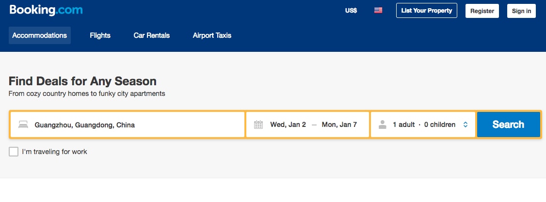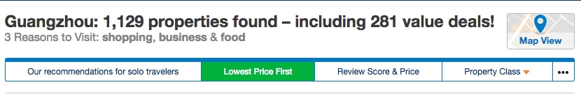 ب- تقوم بكتابة Guangzhou او جوانزو وهي المدينة التي تسافر اليها، ومن ثم تكتب تاريخي الدخول الى الفندق وتاريخ المغادرة وتضغط بحث Search، كما هو موضح في الصورة التالية.