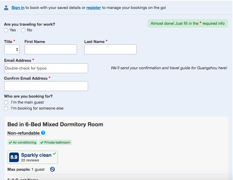ز- بعد ذلك، سيطلب منك الموقع ادخال بياناتك مثل الاسم والبريد الالكتروني واسم الضيف الرئيسي وبعض الخيارات الاخرى، وبعد الانتهاء من ملئها تضغط على التفصايل الاخيرة لتأكيد الحجز ومن ثم سيتم ارسال رقم الحجز الخاص بك على البريد الالكتروني وعندما تذهب الى الفندق سيطلبه منك موظف الاستقبال ومن ثم يمكنك دفع المبلغ بعد السفر وهذا افضل.