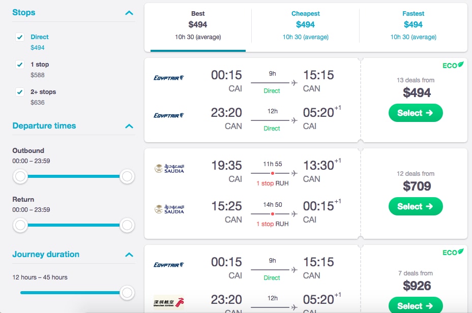 ج- ستظهر لك نافذة اخرى تحتوي على العروض والاسعار، وطبعًا تختار منها الرحلة الانسب من حيث السعر والراحة، وفي حالتنا هذه الرحلة الافضل هى الاولى، حيث يبلغ سعرها ٤٩٤ دولار (ذهاب وعودة) دون توقف.