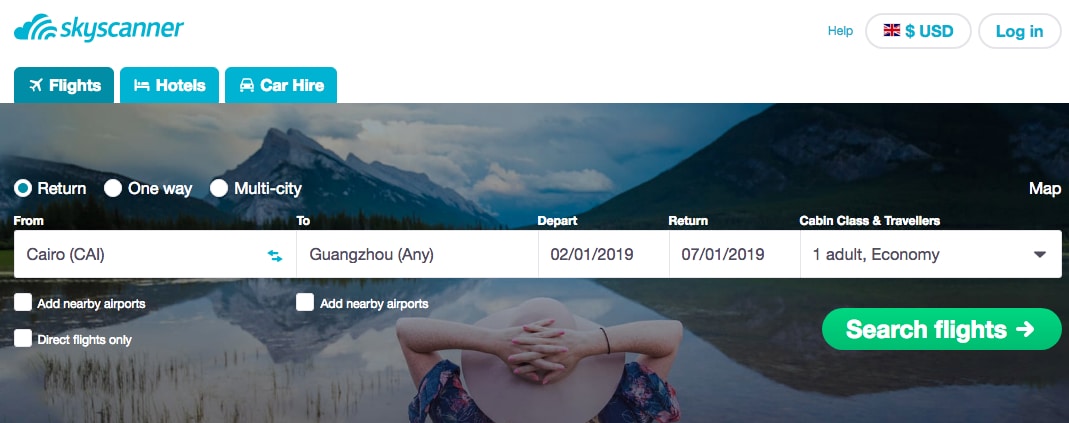 ب- بإفتراض انك ستسافر في اول العام وبالتحديد في الفترة من ٢ يناير الى ٧ يناير من القاهرة الى جوانزو (أهم الوجهات التجارية والسياحية في الصين ويسميها البعض مدينة الجملة حيث يباع فيها تقريبا جميع البضائع الصينية). فإنك تقوم بملء البيانات كالتالي وتضغط على Search flights.